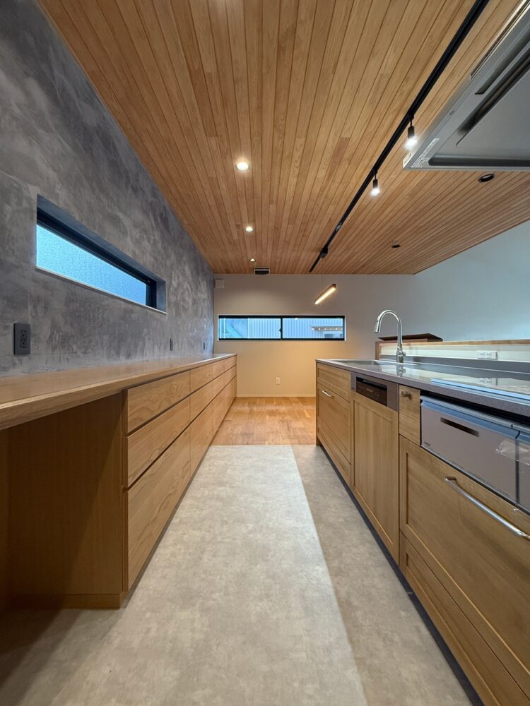 キッチン背面にはスタッコ調の仕上げを採用。
