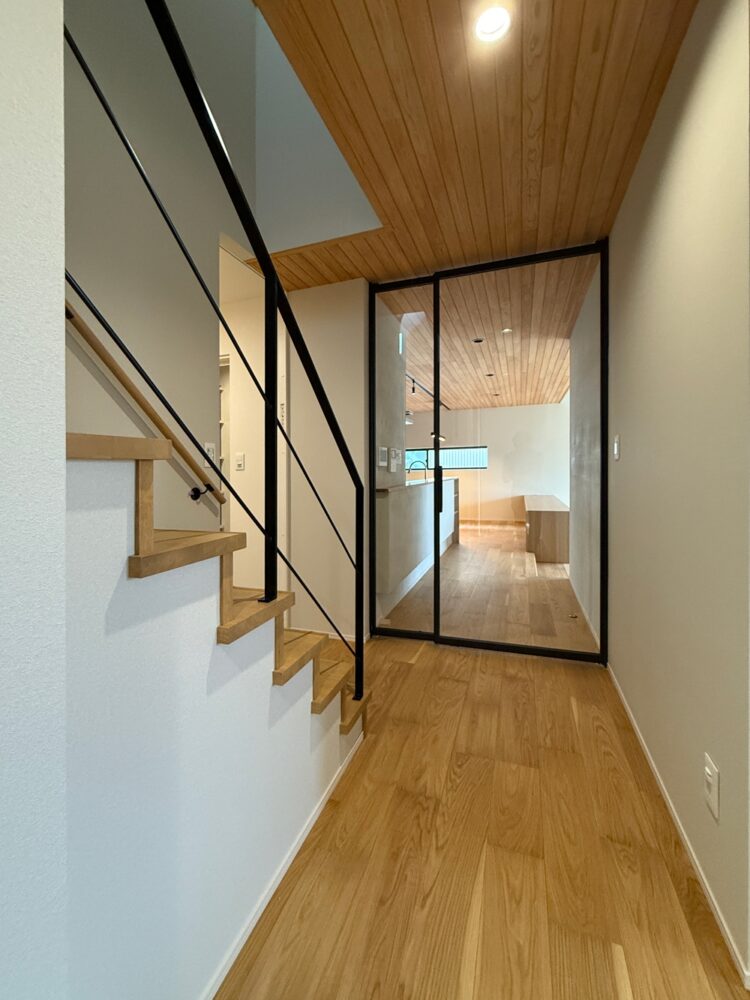 玄関からリビングまで、視線が抜けるガラス戸のデザイン。
