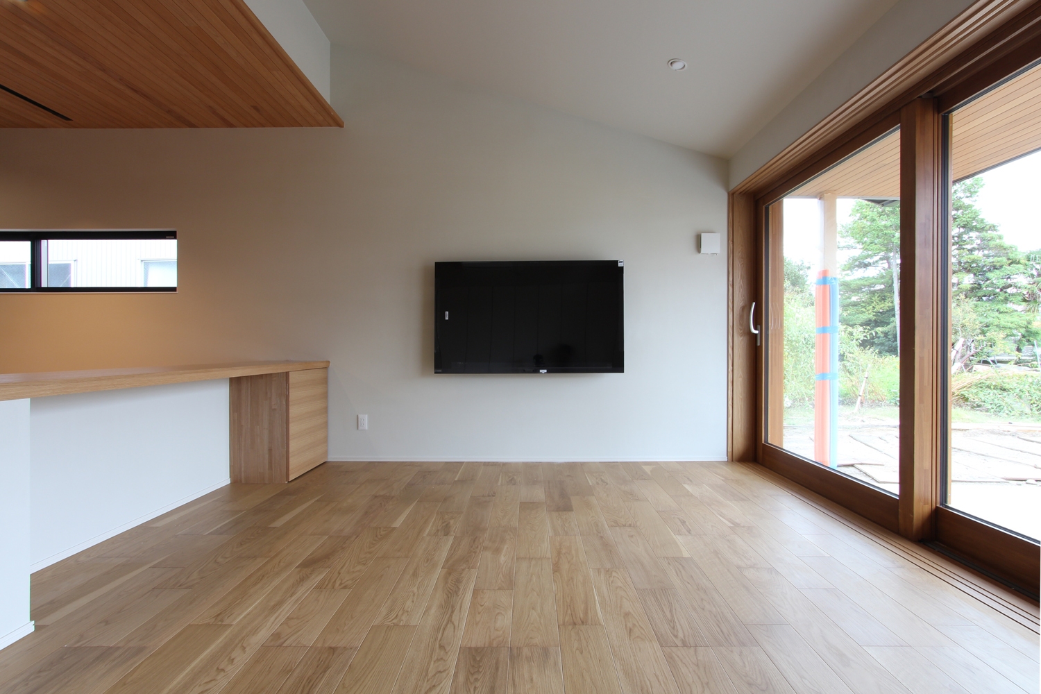 大きな木製サッシの窓からは、庭の緑と光が心地よく入り、室内と屋外の一体感を感じられます。