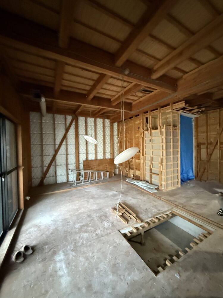 外壁のモルタル壁をすべて撤去し、築30年以上のお住まいを耐震補強とともに改修する現場もあります。