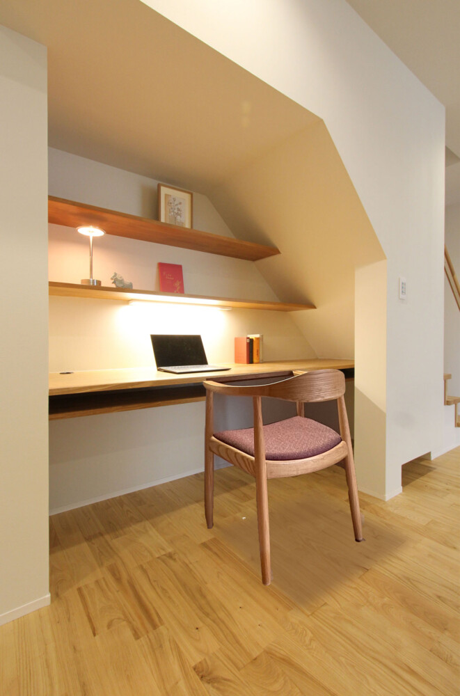 階段下を有効に活用し、コンパクトながらも多機能な場所として計画しました。家事の合間に使えるワークスペースであり、
