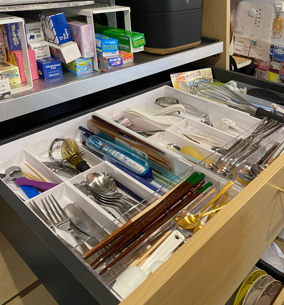 キッチンの引き出し一つひとつが、まるで最初から決まっていたかのように収まっています。