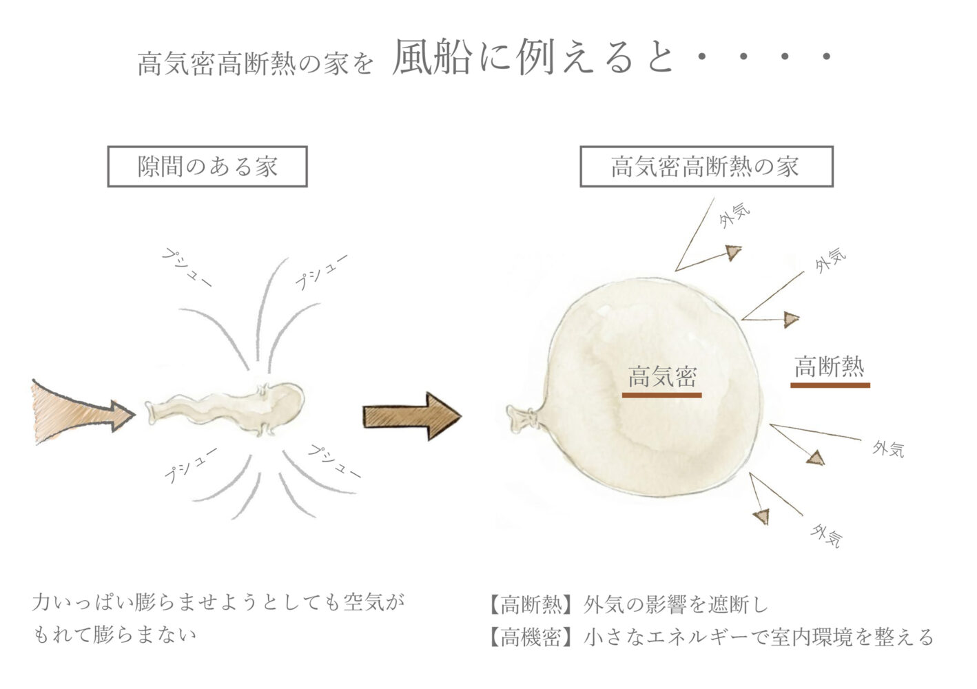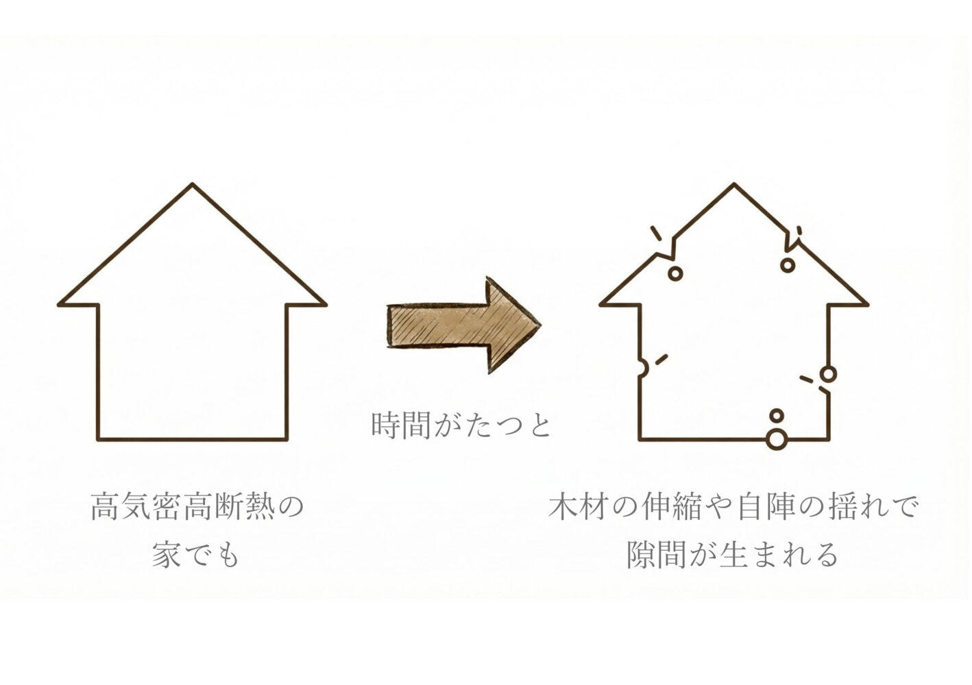 風船に針で小さな穴を開けると、空気が勢いよく抜けていくように、住宅もわずかな隙間が生じるだけで、その性能は大きく低下してしまいます。 一般的な高気密住宅では、新築時は高性能でも、木材の収縮や地震の揺れなどで徐々に隙間が生まれることがあります。