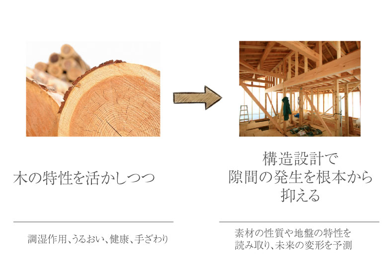 建物の隙間は、主に「揺れ」と素材の「伸縮」から生じます。伸縮は少ないが揺れに弱い鉄筋に対し、木は呼吸し伸縮する特性があります。 私たちは、こうした素材の性質や地盤の揺れ方を読み解き、未来の変形まで予測して構造を設計。建物を「動きにくく」精密に組むことで隙間の発生を根本から抑え、気密性能を永く守り抜きます。