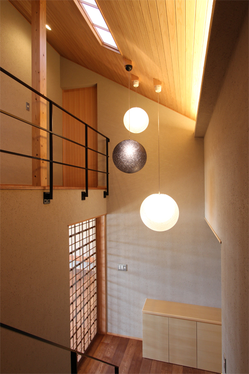 玄関を入ると、柔らかな光を放つ照明「MAYUHANA(マユハナ)」が出迎える吹き抜け空間が広がります。見上げれば、屋根の形状に合わせた杉のR天井から、トップライトの自然光が優しく降り注ぎます。リビングへと続く造作建具は、家具職人であるS様の感性と響き合うこだわりの格子戸。ミリ単位まで計算されたデザインが、訪れる人を「上質な日常」へと誘います。