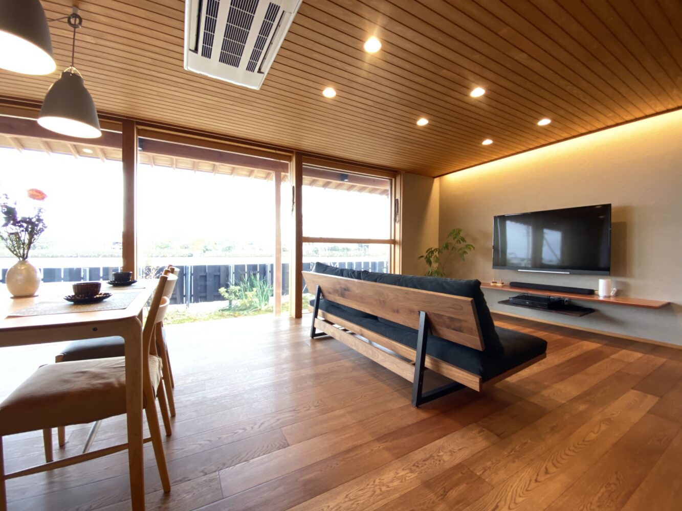 一歩中に入ると広がるのは、大野川の風景を独り占めできる圧巻のリビング。 杉の無垢天井と、呼吸する塗り壁に包まれた空間は、木窓をフルオープンにすることで、まるで川の上に浮かんでいるかのような一体感を味わえます。