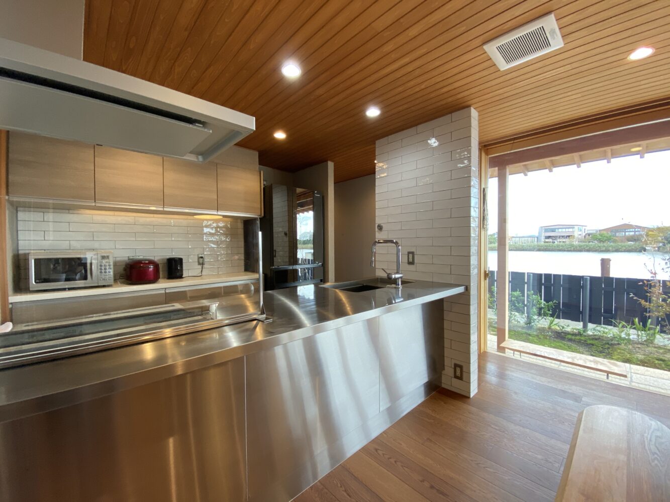 木の温もりあふれる空間の中で、凛とした存在感を放つオールステンレスのキッチン。プロの厨房のような機能美と清潔感を備えています。背後には大きなパントリーを設けることで、生活感が出やすいキッチン周りを常にスッキリと美しく保つことができます。「見せる」と「隠す」のバランスが、丁寧な暮らしを支えます。