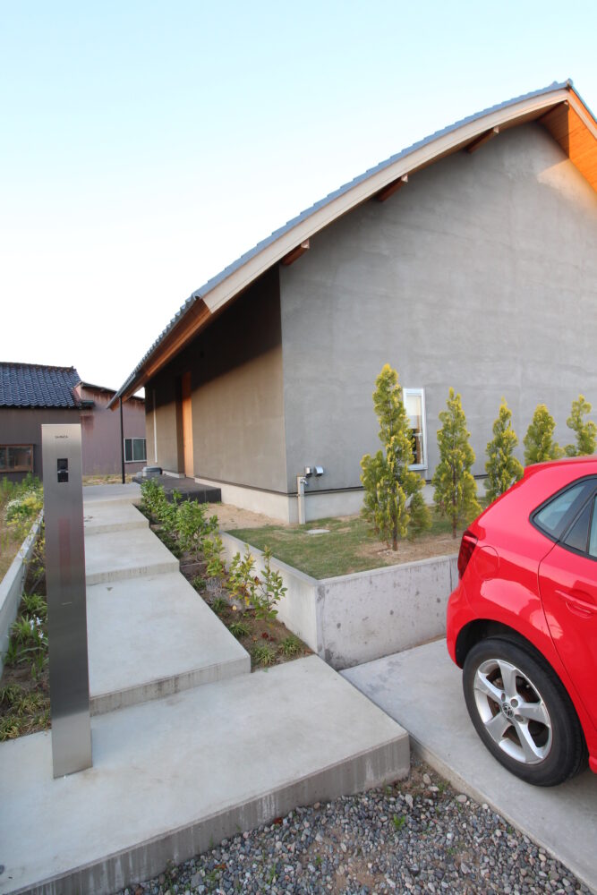 やわらかなR(曲線)を描く屋根と、温かみのある塗り壁が調和したシンプルな外観です。特筆すべきは、玄関の軒の長さ。通常、雪深い石川県では雪の重みで垂れ下がってしまうため実現困難とされる「1200mm」もの深い軒を実現しました。これを可能にしたのが、力学的に強度を確保できるR形状の屋根構造です。アプローチには、雪が落ちても折れにくい強さを持つ「ツキツバメ」を植栽し、冬の景色さえも美しく変える工夫を凝らしています。