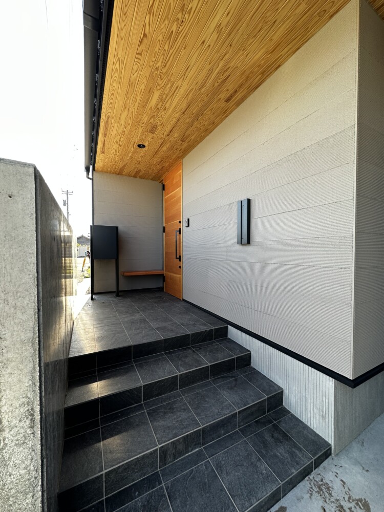 玄関へと続くアプローチには、深い軒を設けました。雨の日でも濡れることなく出入りができ、無垢材の玄関扉とベンチが温かみを添えます。今や暮らしに欠かせない宅配ボックスも、デザインに溶け込むように設置しました。