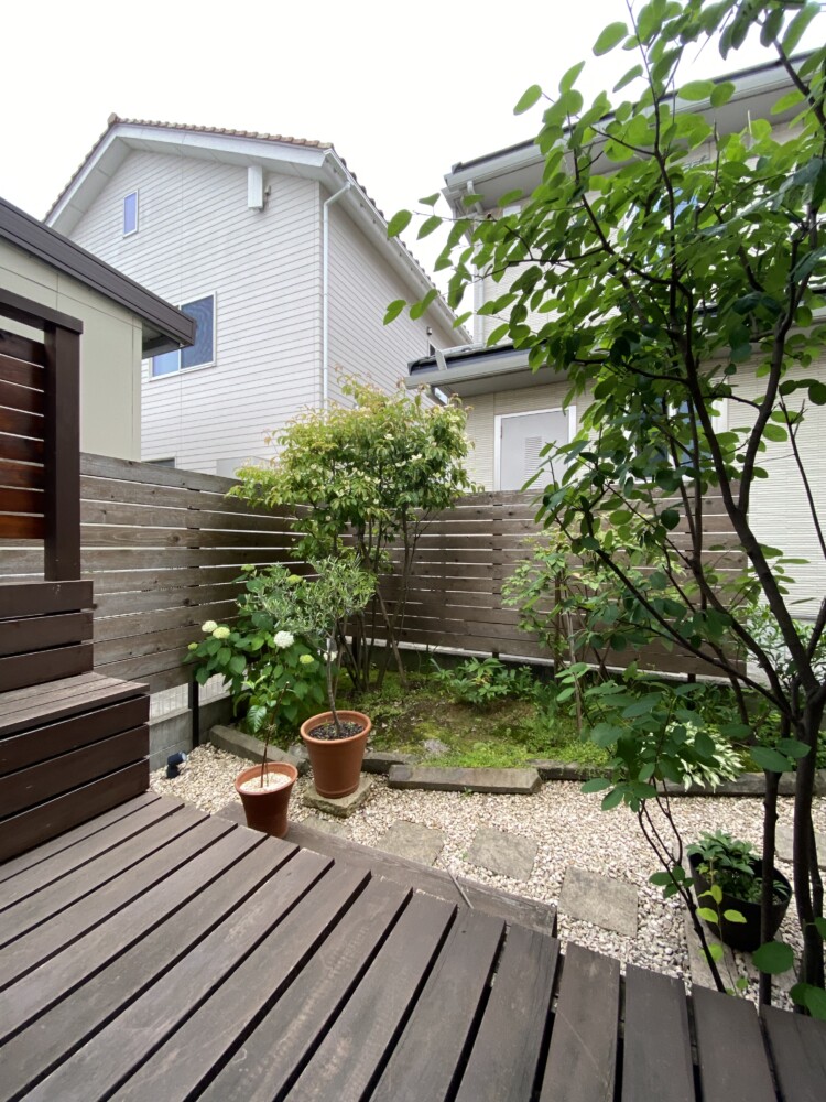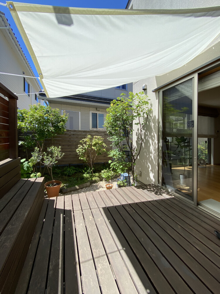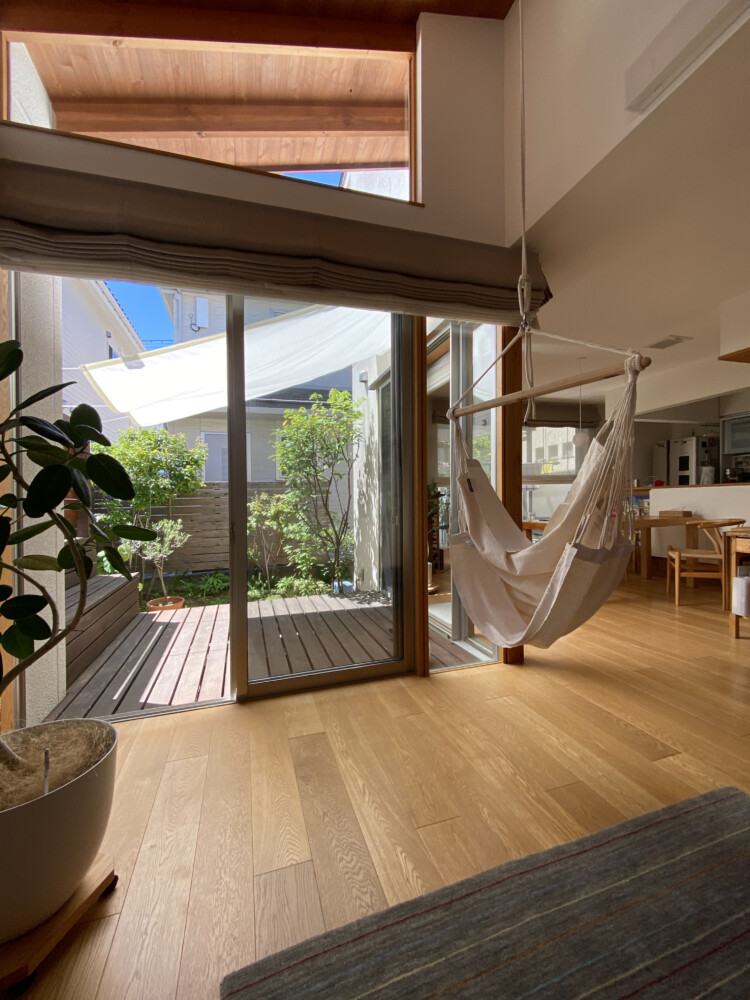 玄関とリビングダイニング、そしてデッキを介した庭がつながり、外と一体となる開放的で明るい住まいを実現しました。
