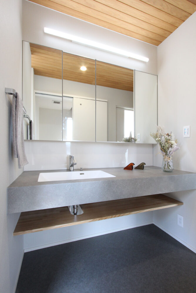 大人が2人並んで使える造作洗面カウンターを設け、