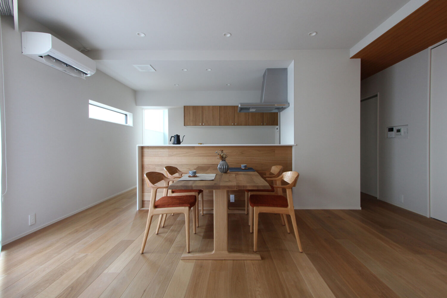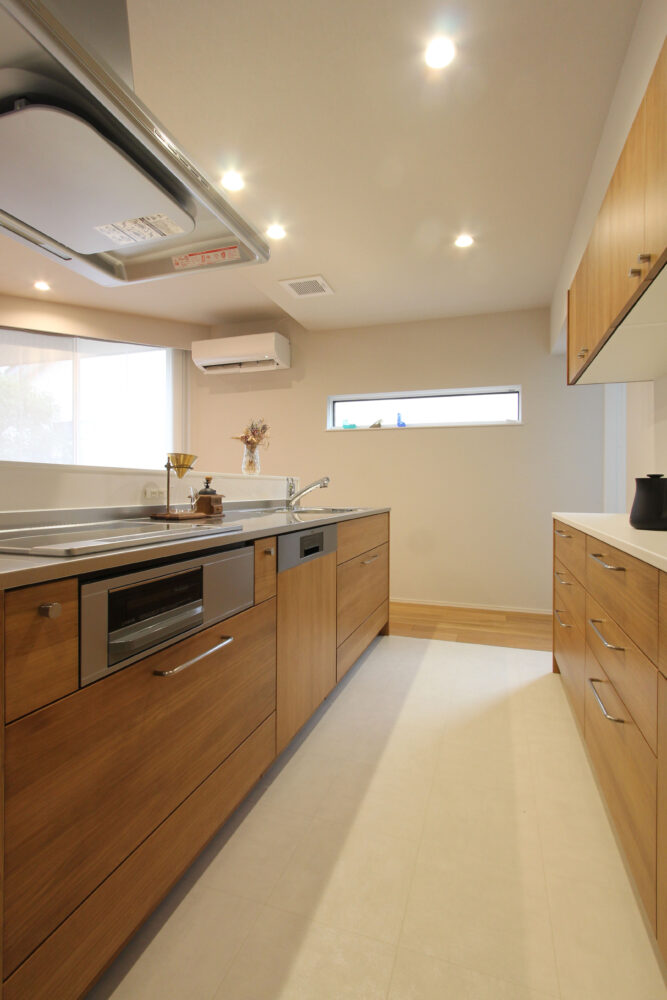 キッチンはウッドワンの無垢キッチンに、AEGの食洗機を組み合わせ、家事負担を軽減しています。