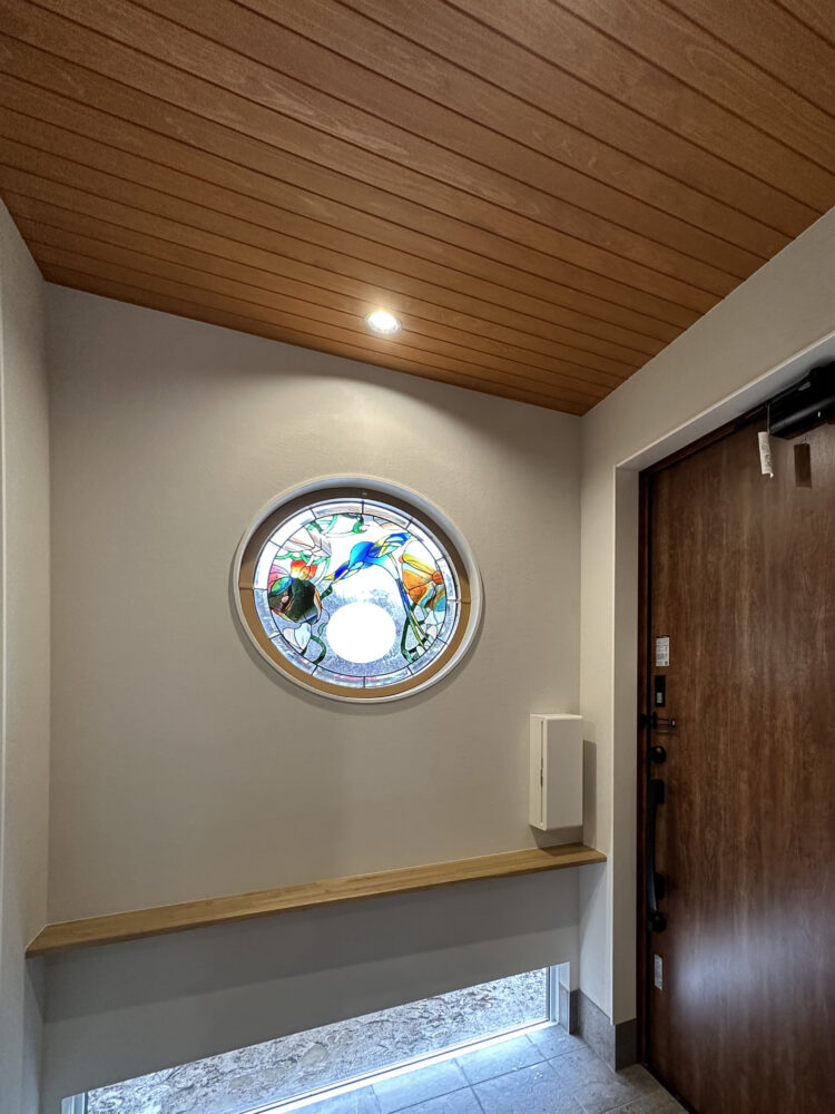 玄関には、奥様のお母様から結婚祝いに贈られたステンドグラスを設え、家族の想いを大切に受け継ぐ住まいとなりました。