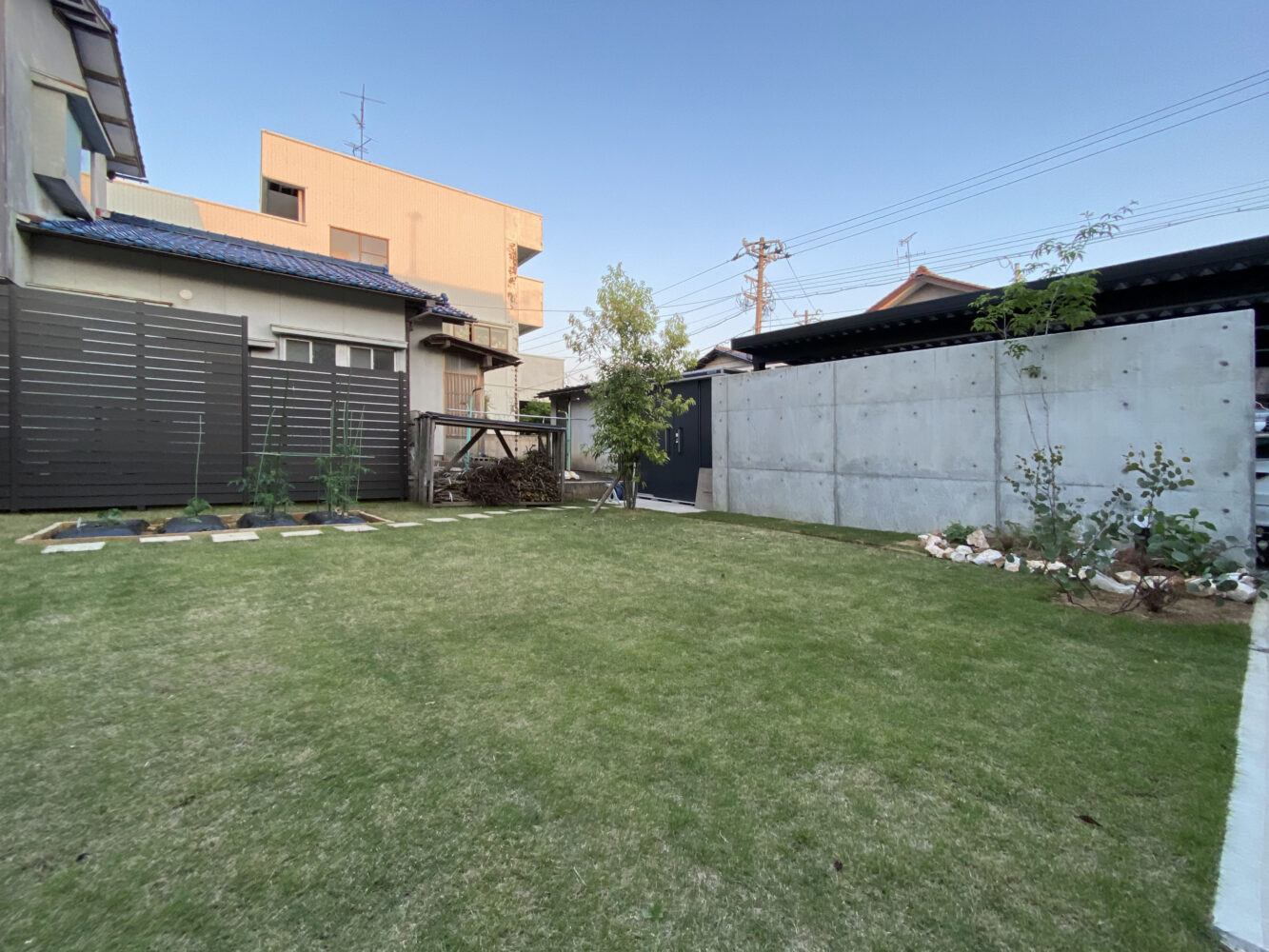 広い敷地を活かし、南側には芝生の庭と家庭菜園、バーベキュースペースを計画。