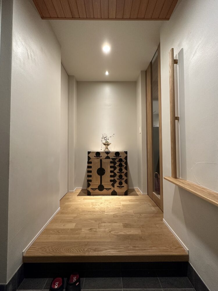 自然素材にこだわり、壁と天井はドイツ漆喰、床はクリの無垢フローリングを採用。