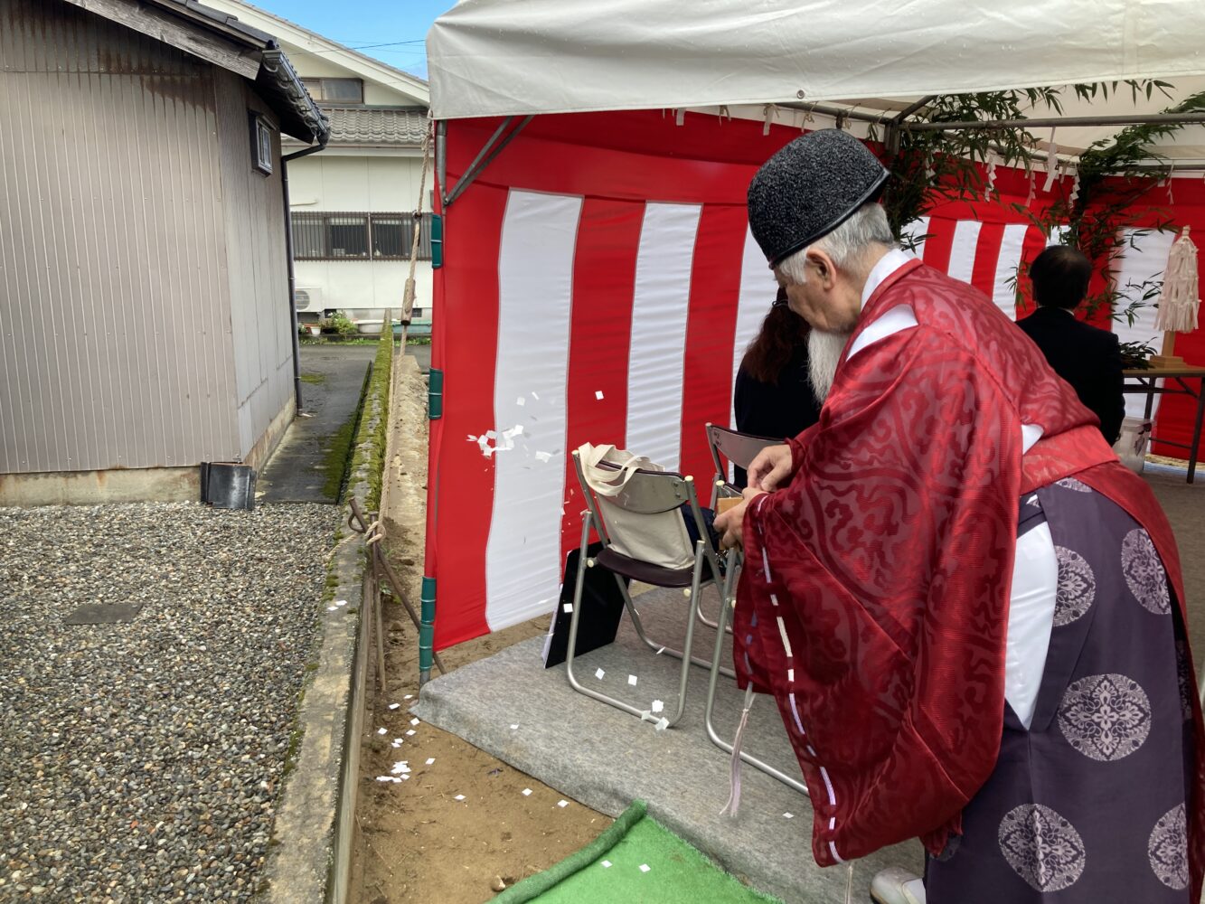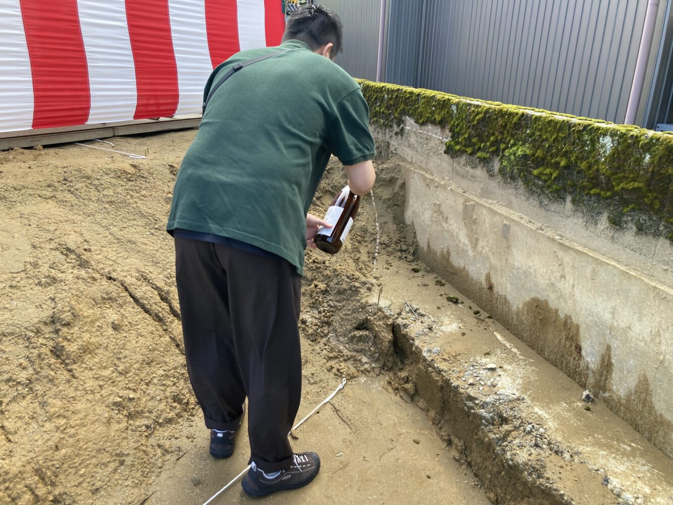 敷地の四隅にお米・お塩・お酒をまき、土地を清めて神様に感謝を伝えました。