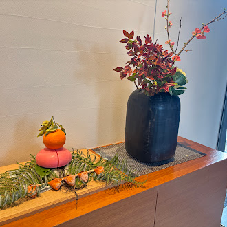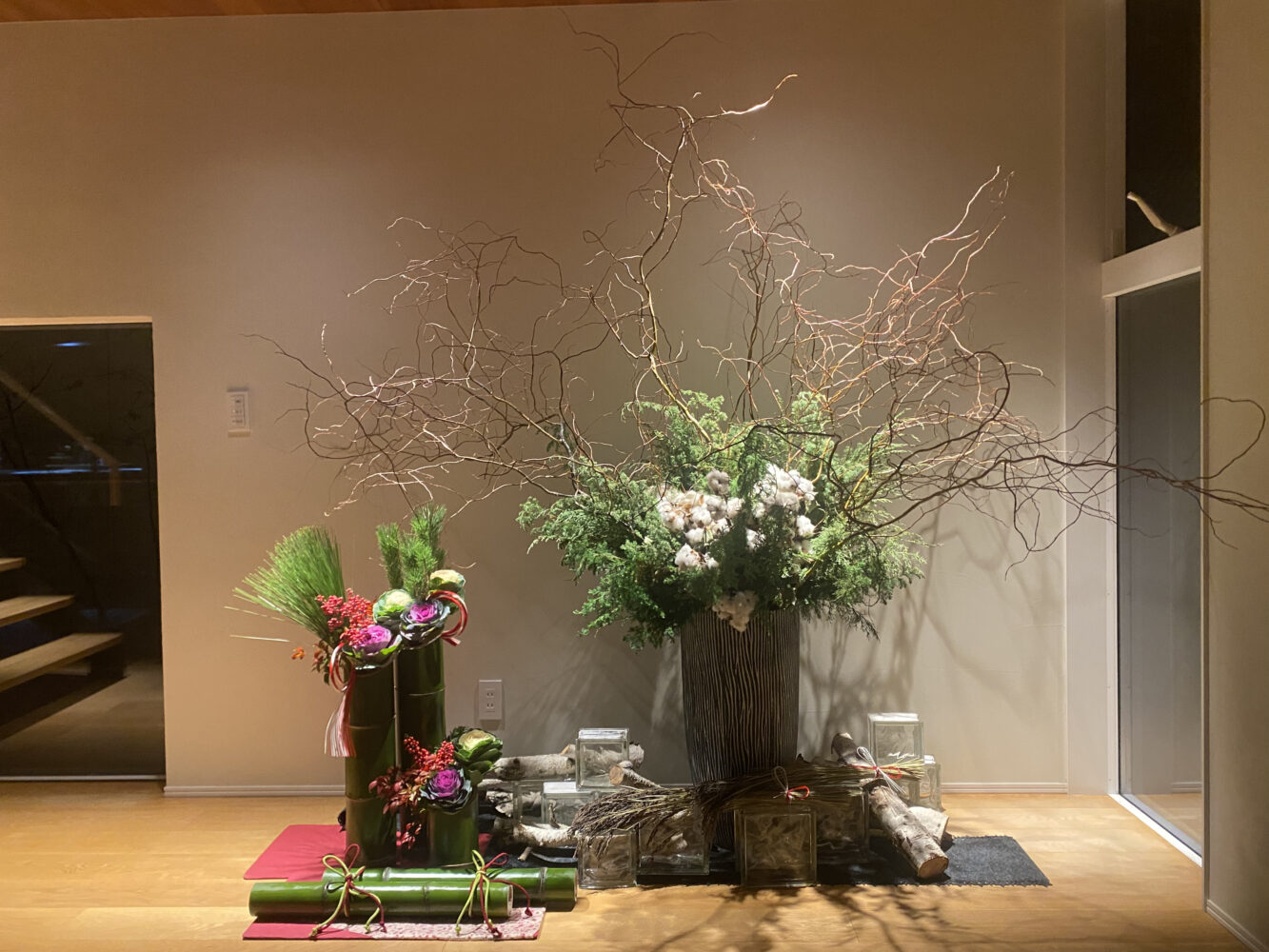 観田創建のエントランスを彩るウェルカムアレンジメントも、お正月の装いに変わりました。