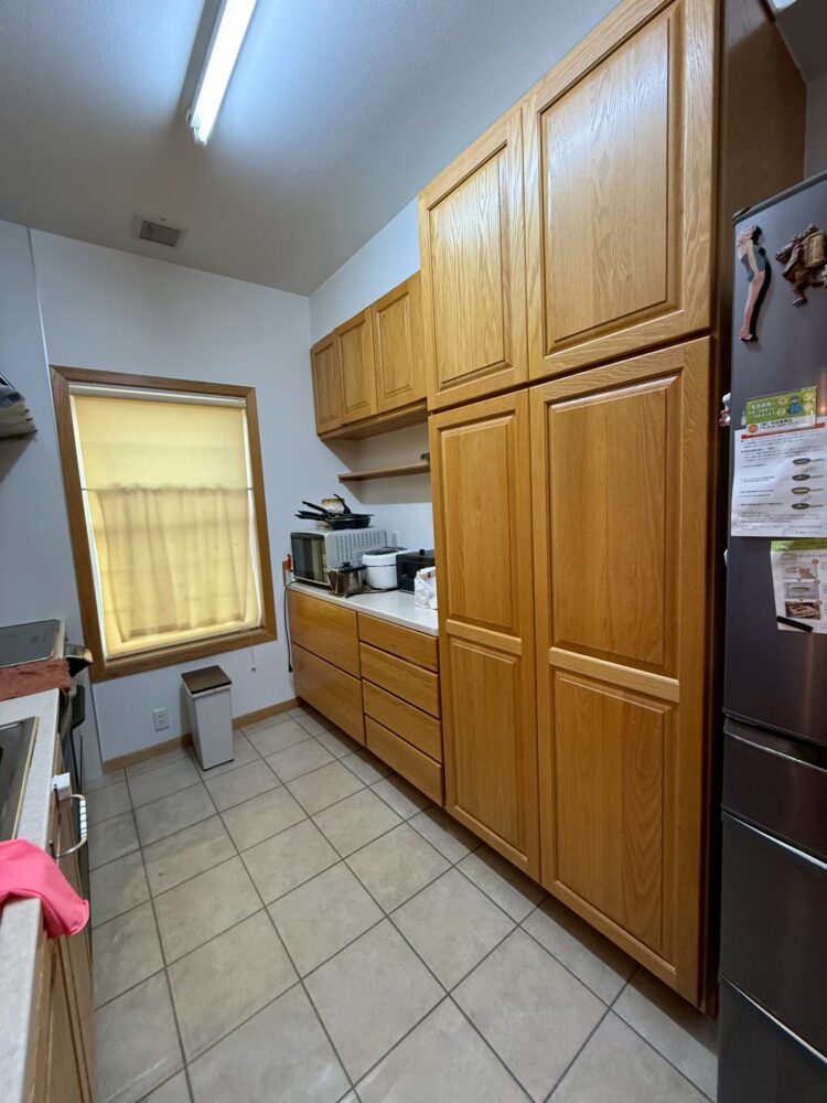 伝統的な在来工法ではなく、ツーバイフォー工法でアメリカ人の大工さんが建てたお住まいとのことで、洋風な外観と天井高のあるキッチンスペースが特徴的でした。