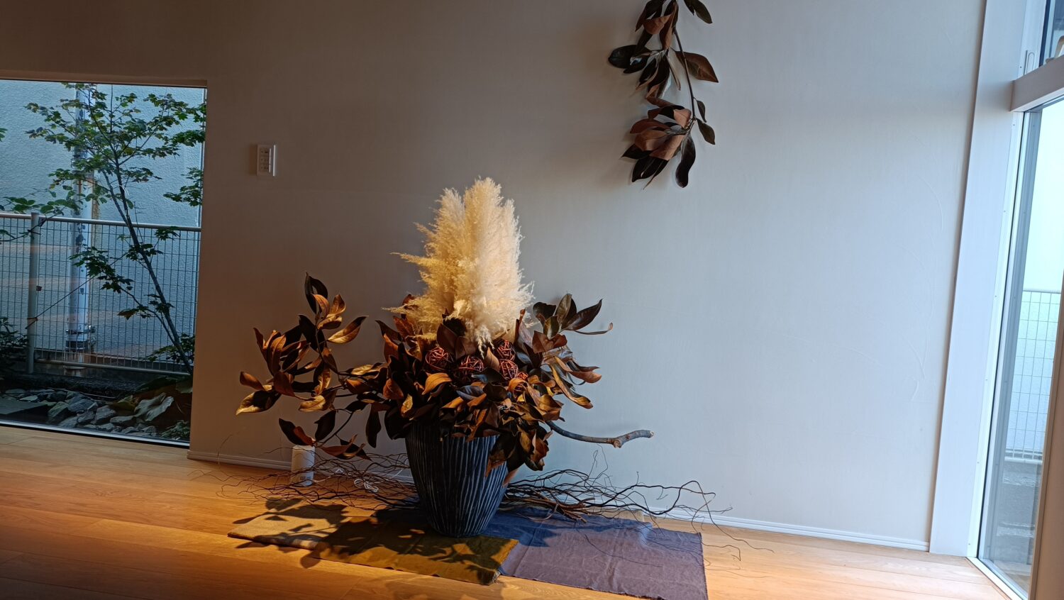 観田創建のエントランスを彩るウェルカムアレンジメントも、秋の装いに変わりました。