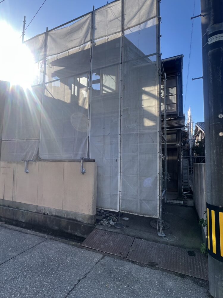 朝からトラックが到着し、職人さんたちが手際よく足場を組み始めました。 カンカンという金属音と共に、あっという間にシートに覆われていきます。
