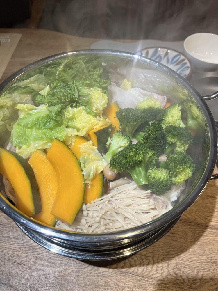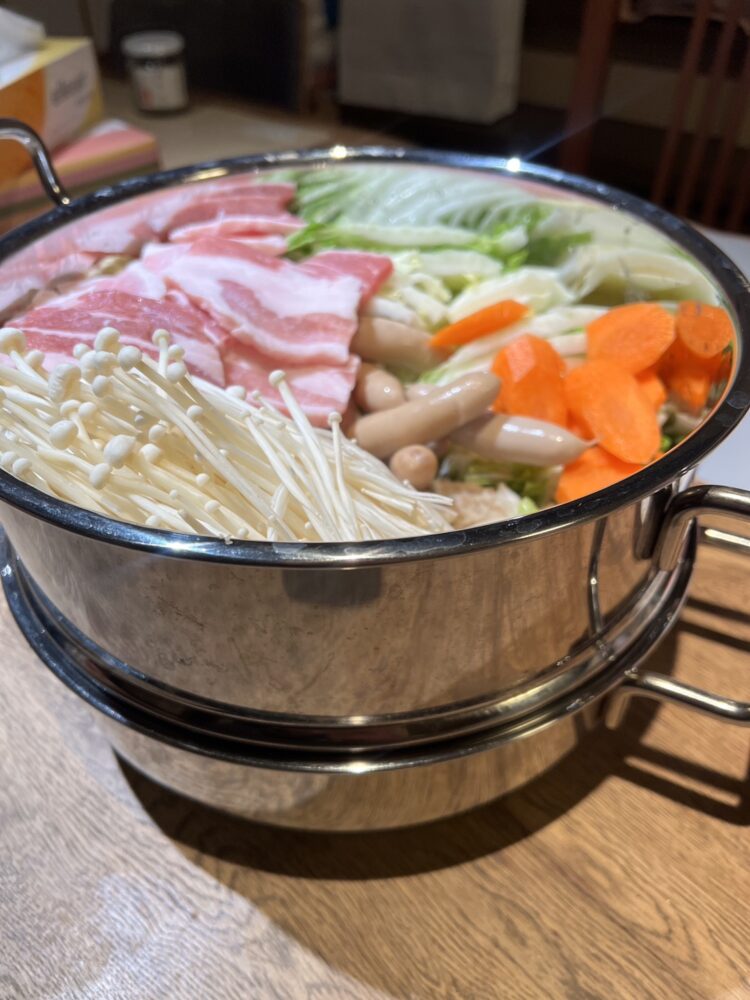 定番の具材は白菜、冷凍シュウマイ、しめじ、エノキ、豚バラ肉、ウィンナー、人参、かぼちゃ、ブロッコリー(レンコン、もやしは今回無しです)