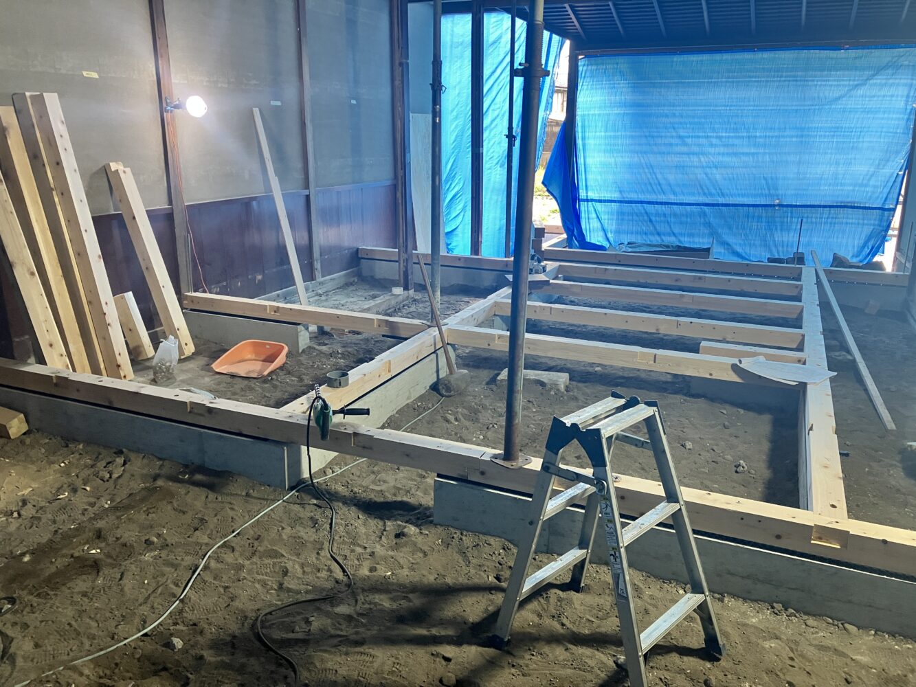 解体を終えて、いよいよ本格的な改修工事が始まりました。まずは 基礎・土台の補強 をしっかりと行い、建物を支える「根っこ」の部分を見直していきます。既存の土台を確認したところ、100年の年月を経てもなお健全な状態の部分もあり、昔の職人さんの技術の確かさに改めて感動しました。